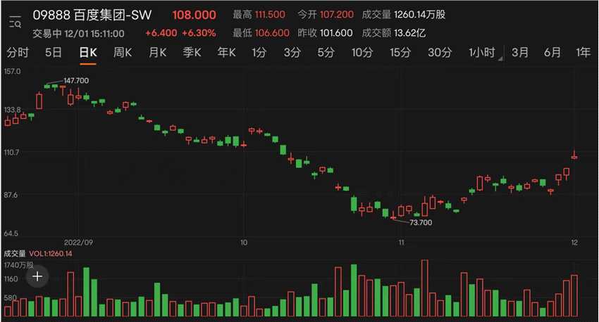摘要: 12月1日百度集團(tuán)-SW(09888.HK)今日一度漲超9%,截至發(fā)稿漲6.3%。值得注意的是,百度股價(jià)本周連續(xù)上行,累計(jì)漲幅超17%,在港股科技股中顯得異?;钴S。