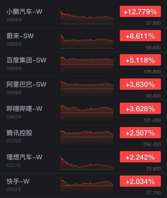 新浪科技訊 12月1日下午消息,香港恒生指數(shù)高開低走收漲0.75%,恒生科技指數(shù)漲1.08%。熱門科技股多數(shù)上漲,小鵬汽車漲超12%,蔚來漲超8%,百度集團漲超5%,阿里巴巴、嗶哩嗶哩漲超3%,騰訊、快手漲超2%。
