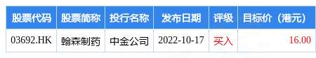 截至2022年12月2日收盤,翰森制藥(03692.HK)報(bào)收于14.82元,下跌0.13%,換手率0.15%,成交量870.17萬股,成交額1.3億元。投行對該股的評級以買入為主,近90天內(nèi)共有1家投行給出買入評級,近90天的目標(biāo)均價(jià)為16?!?a href="http://m.xfjyyzc.com/gegu/601995/" target="_blank" title="中金公司(601995)股票分析,新聞,資金流向,財(cái)務(wù)數(shù)據(jù)" >中金公司(601995)、股吧】最新一份研報(bào)給予翰森制藥買入評級,目標(biāo)價(jià)16。