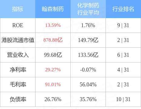 翰森制藥港股市值878.88億港元,在化學(xué)制藥行業(yè)中排名第2。主要指標(biāo)見下表: