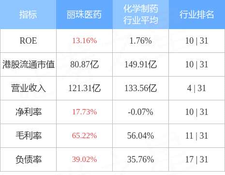 麗珠醫(yī)藥港股市值80.87億港元,在化學(xué)制藥行業(yè)中排名第10。主要指標(biāo)見(jiàn)下表: