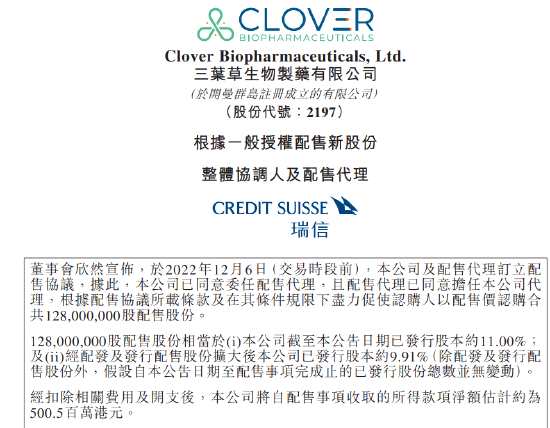 摘要: 三葉草生物發(fā)布公告,公司擬配售1.28億股,占公司擴(kuò)大后總股本的9.91%,籌資總額5億港元,配售價(jià)3.95港元,較昨日收市價(jià)折讓13%。值得注意的是,三葉草生物自11月以來漲幅近2倍,