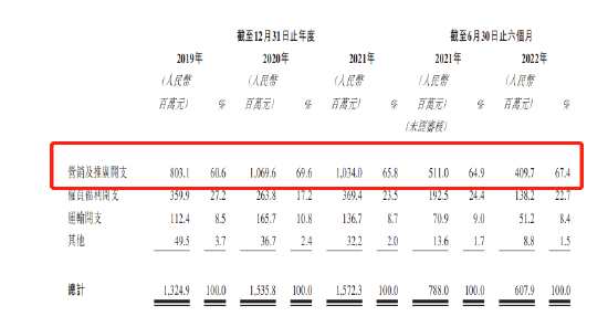 在廣告上呂義雄三年半砸了32億,招股書顯示,2019年-2022上半年,上美集團(tuán)的銷售及分銷費(fèi)用分別為13.25億元、15.36億元、15.72億元6.08億元,占其總收入的46.1%、45.4%、43.4%和48.2%。其中,營(yíng)銷推廣費(fèi)用分別為8.03 億元、10.7億元、10.34億元、4.09億元,且在銷售費(fèi)用中的占比逐年走高,三年半時(shí)間砸了32億。