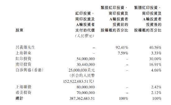 2015年4月,公司引入A輪融資,引入紅印投資、南印投資等,共計(jì)融資3.87億元,融資后呂義雄持股減少為40.56%。紅印投資、南印投資及上海誠(chéng)印為公司員工持股平臺(tái)。