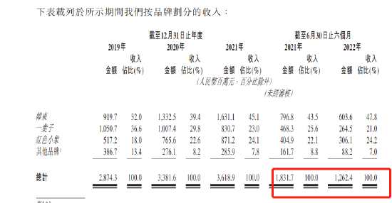根據(jù)公司招股書,在三大品牌中,韓束一直占據(jù)主要份額,2022年前6個(gè)月實(shí)現(xiàn)收入6.04億,營(yíng)收占比高達(dá)47.8%,不過(guò)收入下滑嚴(yán)重,同比下滑24.25%。同期,一葉子實(shí)現(xiàn)收入2.65億,營(yíng)收占比不斷下滑,目前為21%;紅色小象實(shí)現(xiàn)營(yíng)收3.06億,營(yíng)收占比擴(kuò)大至24.2%,超過(guò)了一葉子的營(yíng)收。