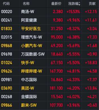 12月7日消息,恒生科技指數(shù)漲幅擴(kuò)大至3%,商湯漲近16%,阿里健康漲近10%,快手漲近6%,美團(tuán)漲超4%。