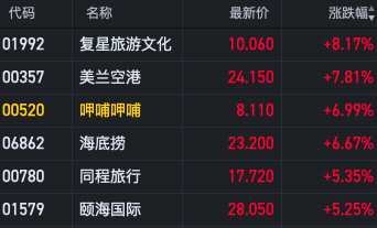 消費股午后拉升 復(fù)興旅游文化漲超8%呷哺呷哺、海底撈漲近7%
