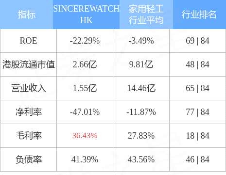 SINCEREWATCH HK港股市值2.66億港元,在家用輕工行業(yè)中排名第48。主要指標(biāo)見(jiàn)下表: