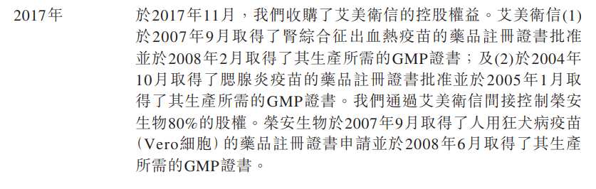 根據(jù)招股書的信息,艾美疫苗的前身沈陽沃頓生物成立于2011年在2015年便收購了艾美誠信,它的主要產(chǎn)品便是乙肝疫苗。到了2017年,艾美疫苗通過收購艾美衛(wèi)信,間接控制了榮安生物,而這家公司的主要產(chǎn)品正是前文中提到的Vero細胞人用狂犬病疫苗,也難怪市值風云在分析時會說“艾美疫苗的核心經(jīng)營模式就是不斷收購”了。