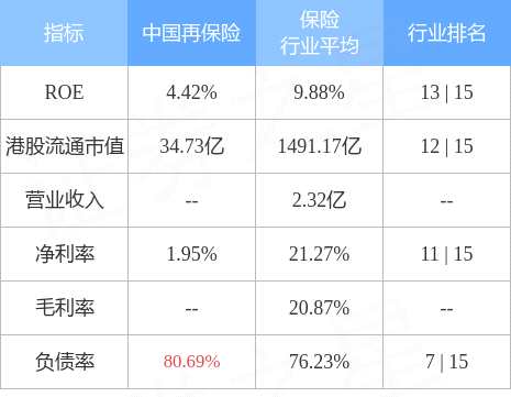 中國(guó)再保險(xiǎn)港股市值34.73億港元,在保險(xiǎn)行業(yè)中排名第12。主要指標(biāo)見(jiàn)下表: