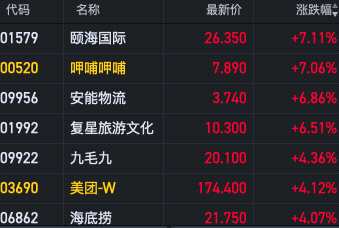12月8日消息,消費股集體走高,頤海國際、呷哺呷哺漲超7%,復興旅游文化張6.51%,九毛九、美團漲超4%。