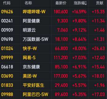 12月7日消息,恒生科技指數(shù)漲幅擴大至5%,嗶哩嗶哩漲近17%,阿里健康漲近10%,快手漲8%,網(wǎng)易漲超7%,美團漲近6%,阿里漲超5%。