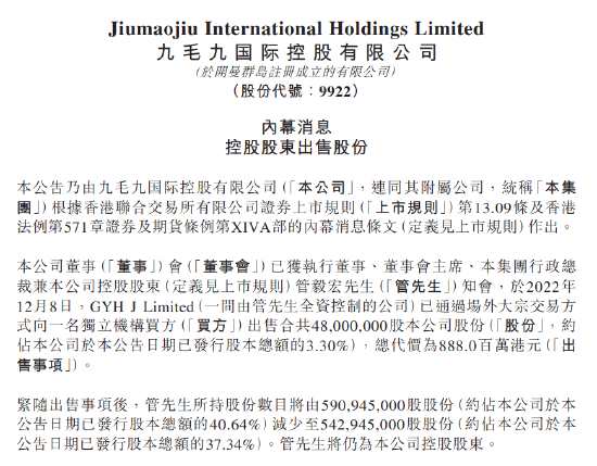 九毛九遭控股股東管毅宏通過場外交易出售4800萬股,套現(xiàn)8.88億港元