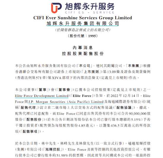 旭輝永升遭控股股東折讓9%配股,配售代理已同意配售,而Elite Force已同意出售其持有的公司合共 9000萬(wàn)股股份(配售股份)(占公司已發(fā)行股本總額約5.15%)予若干獨(dú)立投資者,配售價(jià)為每股配售股份4.85港元,以籌集4.37億港元的所得款項(xiàng)。