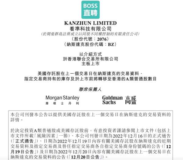 根據(jù)公告,BOSS直聘預(yù)期A類普通股將于2022年12月22日(星期四)開(kāi)始在香港聯(lián)交所買(mǎi)賣。