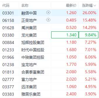 12月22日消息,港股內(nèi)房股走高,融信中國漲26%領(lǐng)漲,正榮地產(chǎn)漲15.48%,禹洲集團漲超14%,龍光集團漲近10%,旭輝控股集團漲超7%。