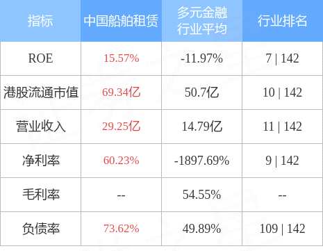 中國船舶租賃港股市值69.34億港元,在多元金融行業(yè)中排名第10。主要指標見下表: