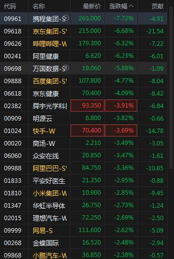 12月29日消息,恒生科技指數(shù)跌幅擴(kuò)大至3%,攜程跌近8%,京東跌近7%,嗶哩嗶哩、阿里健康跌超6%,百度跌近5%,快手跌近4%,阿里跌超3%。