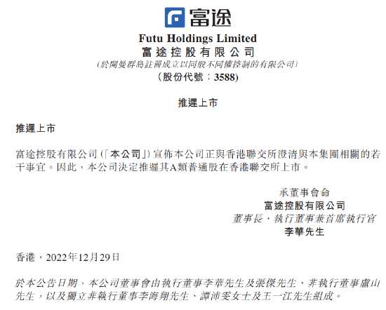 富途發(fā)布公告,公司正與香港聯(lián)交所澄清與本集團(tuán)相關(guān)的若干事宜。因此,公司決定推遲其A類普通股在香港聯(lián)交所上市。