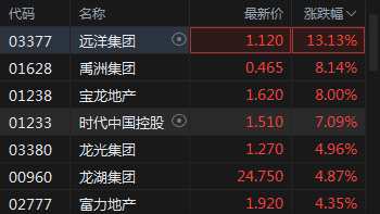 內(nèi)房股、物業(yè)股尾盤(pán)拉升 遠(yuǎn)洋集團(tuán)漲超13%佳兆業(yè)美好漲超14%