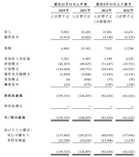 2020年、2021年及2022年前8個(gè)月,康灃生物收入分別為905.4萬(wàn)元、2242.6萬(wàn)元、1643.1萬(wàn)元,期內(nèi)虧損分別為1.59億元、1.26億元、6142.2萬(wàn)元。據(jù)此計(jì)算,康灃生物兩年一期虧損3.47億元。