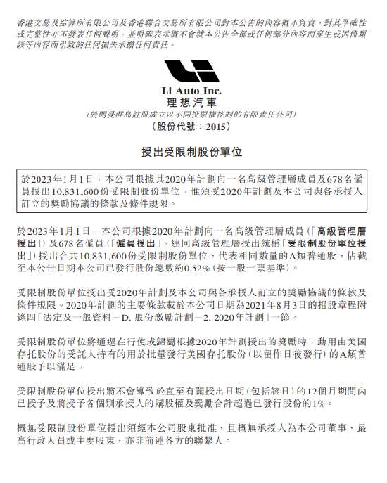 理想汽車1月3日在港交所公告,于1月1日,根據(jù)2020年計劃向一名高級管理層成員及678名雇員授出1083.16萬份受限制股份,占公司已發(fā)行股份總數(shù)約0.52%。