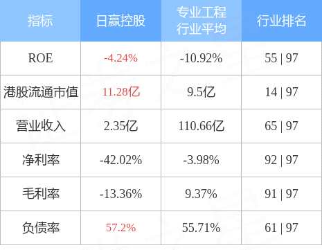 日贏控股港股市值11.28億港元,在專業(yè)工程行業(yè)中排名第14。主要指標(biāo)見(jiàn)下表: