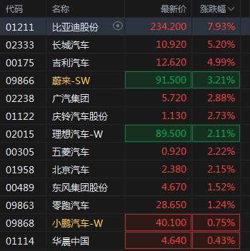 1月12日消息,汽車股直線拉升,比亞迪股份漲近8%,長城汽車漲超5%,吉利汽車漲4.99%,蔚來漲3.21%,廣汽集團(601238)漲2.88%。