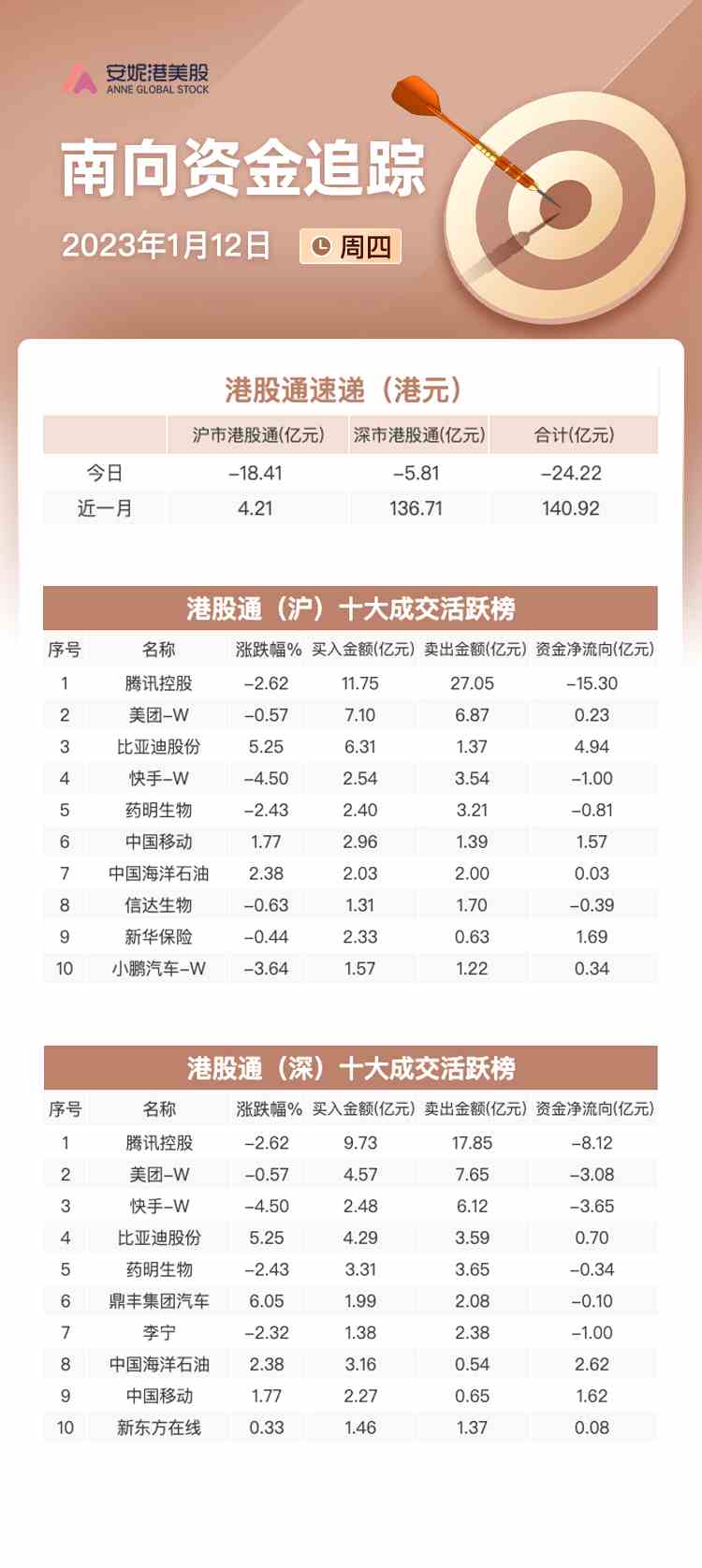 摘要: 1月12日訊據(jù)Wind數(shù)據(jù)顯示,南向資金今日成交405.62億港元,當(dāng)日凈賣出24.22億港元。其中滬港股通凈賣出18.41億港元,深港股通凈賣出5.81億港元。