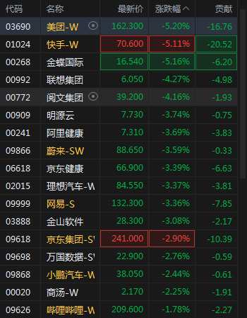 1月16日消息,港股恒生科技指數(shù)午后跌幅擴(kuò)大至2%,美團(tuán)、快手跌超5%,網(wǎng)易跌3.36%,京東跌2.9%,嗶哩嗶哩跌1.78%。