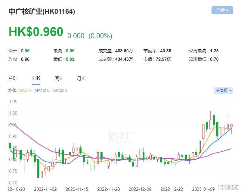 摘要: 大摩發(fā)表報告,首予中廣核礦業(yè)(1164.HK)“增持”評級,目標(biāo)價1.22港元。報告指,供需結(jié)構(gòu)性不平衡及核電復(fù)蘇,料帶動鈾進入上行周期。公司料受惠這趨勢,