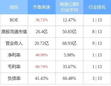 齊魯高速港股市值26.4億港元,在高速公路Ⅱ行業(yè)中排名第8。主要指標(biāo)見(jiàn)下表:
