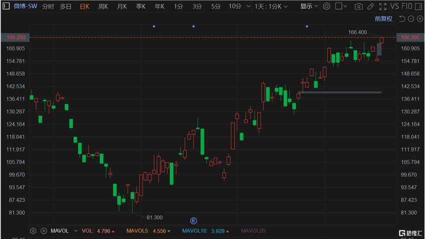 中金最新報告稱,首予微博“跑贏行業(yè)”評級,目標價194港元。該行相信,微博將在其基于用戶的產品和商業(yè)化的支持下恢復增長,未來估值有較大的反彈空間。高盛此前亦上調微博-SW評級至“買入”,目標價升至194港元。