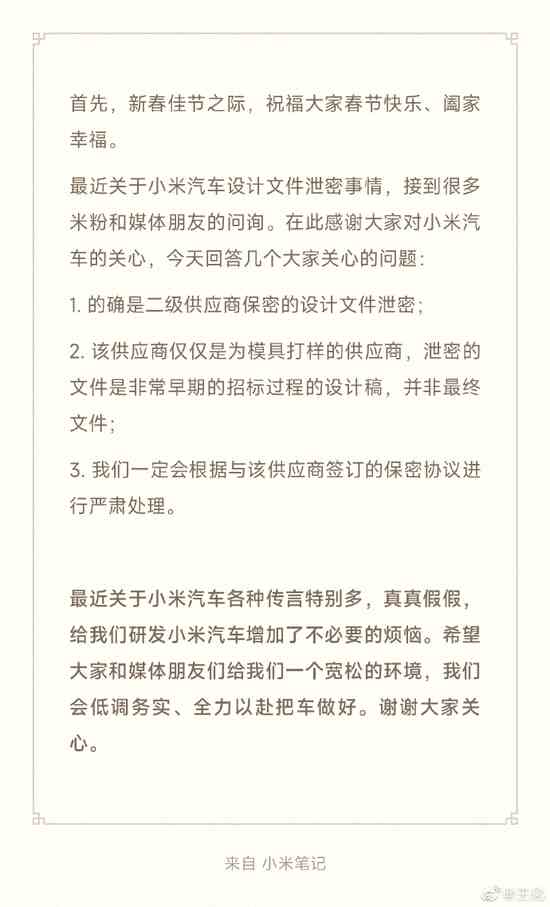 2. 該供應商僅僅是為模具打樣的供應商,泄密的文件是非常早期的招標過程的設計稿,并非最終文件;