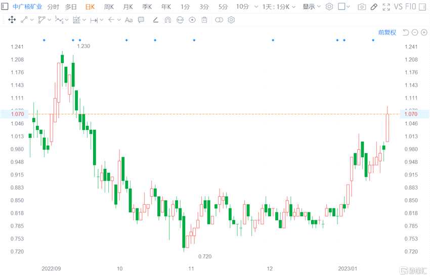 互聯(lián)網(wǎng)1月26日丨中廣核礦業(yè)(1164.HK)今日高開高走,盤中一度大漲超11%至1.09港元,股價(jià)創(chuàng)去年9月21日以來逾4個(gè)月新高。該股曾于2021年大漲約1.2倍,去年亦逆勢累漲近4%頑強(qiáng)跑贏大盤,自2019年至2022年已連漲4年,股價(jià)累漲2.7倍。2023年以來該股延續(xù)漲勢,年初迄今已累漲超30%。