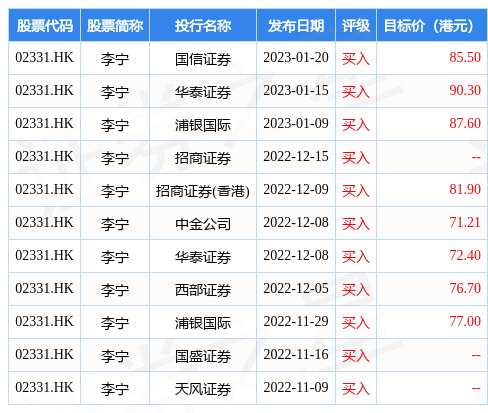 截至2023年1月20日收盤,李寧(02331.HK)報收于74.4港元,上漲2.55%,換手率0.43%,成交量1134.95萬股,成交額8.37億港元。投行對該股的評級以買入為主,近90天內共有11家投行給出買入評級,近90天的目標均價為80.33港元。國信證券最新一份研報給予李寧買入評級,目標價85.5港元。
