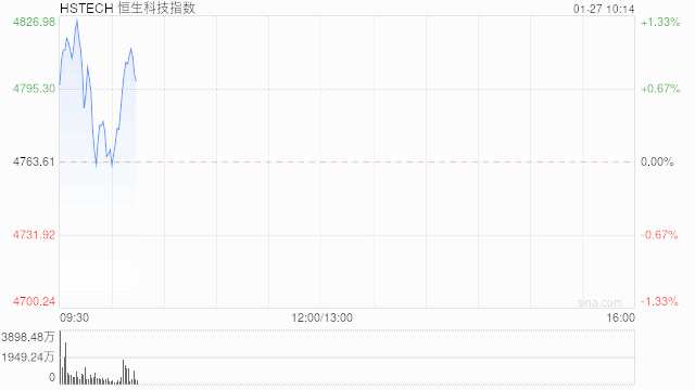 1月27日消息,恒生科技指數(shù)盤初迅速漲超1%。成分股中,商湯漲近5%,金蝶國際漲近4%,舜宇光學科技漲近3%,騰訊漲超2%。