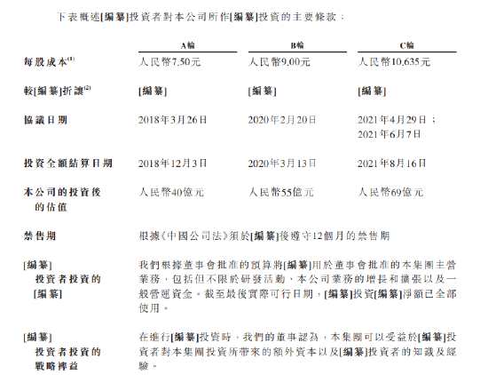 調(diào)整后來(lái)看,A輪每股成本7.5元,投后估值40億;B輪成本9元,投后估值55億;C輪成本10.635元,投后估值69億。此外,各輪投資者有12個(gè)月禁售期。