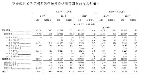 根據(jù)公司業(yè)務(wù)收入明細(xì),公司主要業(yè)務(wù)收入從2019年6成來(lái)自網(wǎng)絡(luò)服務(wù)到2022年前9個(gè)月逾一半的收入來(lái)自醫(yī)療機(jī)構(gòu),相反網(wǎng)絡(luò)服務(wù)貢獻(xiàn)則不足5成。
