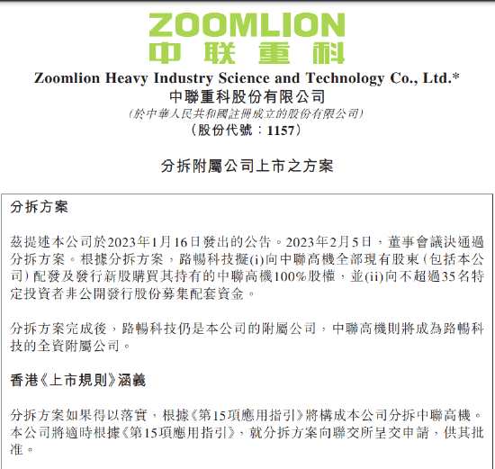 中聯(lián)重科:附屬公司擬分拆上市,中聯(lián)高機將成路暢科技全資附屬公司