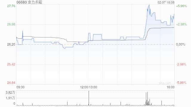 金力永磁(06680)午后急升近6%,截至發(fā)稿,漲4.77%,報27.45港元,成交額788.08萬港元。