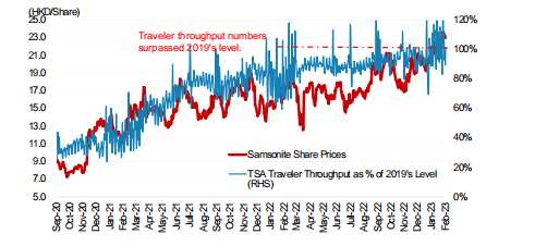 備注:圖中紅線代表新秀麗股價(jià);藍(lán)線代表旅客吞吐量占2019年水平百分比