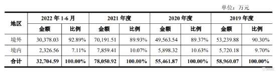 報告期內(nèi),艾芬達的主要業(yè)務(wù)來源于境外銷售,境外銷售收入金額占主營業(yè)務(wù)比例分別為90.30%、89.37%、89.93%、92.89%,占比穩(wěn)定。