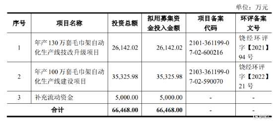 本次IPO擬募資6.65億元,主要用于年產(chǎn)130萬套毛巾架自動化生產(chǎn)線技改升級項目、年產(chǎn)100萬套毛巾架自動化生產(chǎn)線建設(shè)項目、補充流動資金。