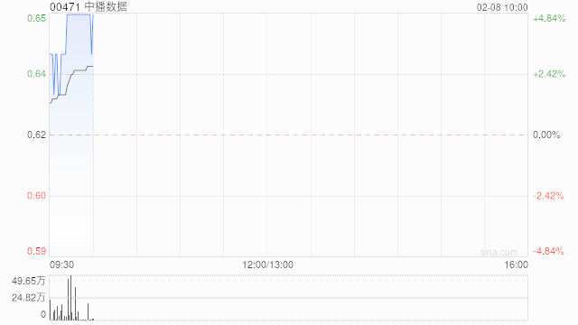中播數(shù)據(jù)(00471)漲近5%,截至發(fā)稿,上漲4.84%,報(bào)0.65港元,成交額170.97萬(wàn)港元。