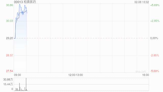 和黃醫(yī)藥(00013)早盤漲超5%,截至發(fā)稿,上漲4.11%,報(bào)30.4港元,成交額1941.13萬港元。