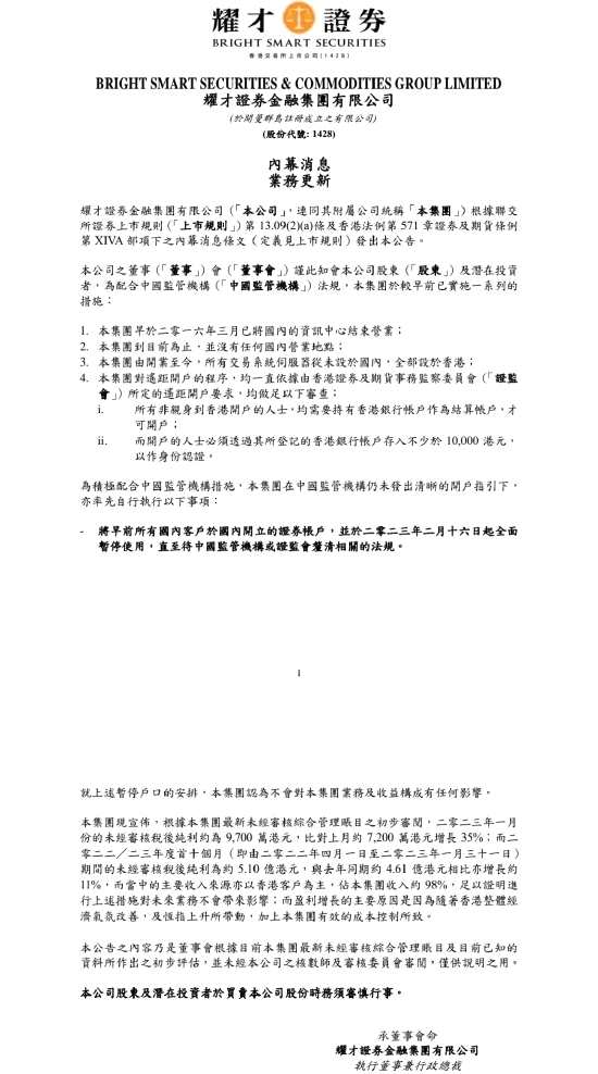 2月13日消息,耀才證券港交所公告,本集團對遙距開戶的程序,均一直依據(jù)由香港證券及期貨事務(wù)監(jiān)察委員會所定的遙距開戶要求,均做足以下審查:(1)所有非親身到香港開戶的人士,均需要持有香港銀行帳戶作為結(jié)算帳戶,才可開戶;(2)而開戶的人士必須透過其所登記的香港銀行帳戶存入不少于10,000港元,以作身份認證。
