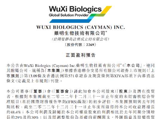 摘要: 藥明生物發(fā)布公告,集團預(yù)期與去年同期比較,截至2022年12月31日止年度所取得的公司收益將增長約48.4%;公司利潤及歸屬于公司權(quán)益股東的利潤相比于去年同期分別增長約29%及約30%;以及經(jīng)調(diào)整股份