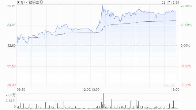 君實(shí)生物(01877)午后明顯反彈,一度升約7%,現(xiàn)漲5.56%,報(bào)34.95港元,成交額5235.47萬港元。