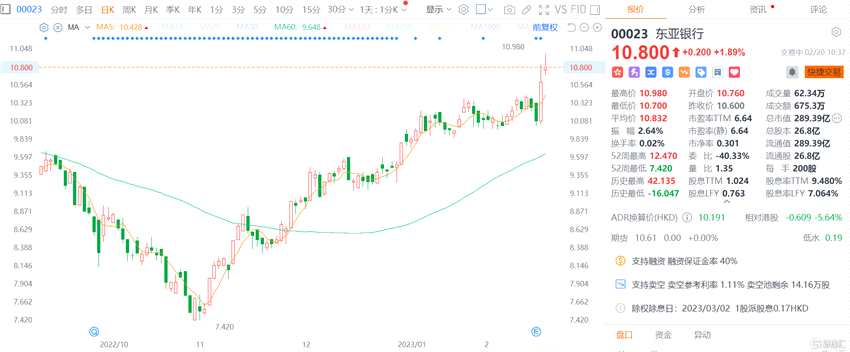 摘要: 互聯(lián)網(wǎng)2月20日丨東亞銀行漲約2%,盤中高見10.98港元創(chuàng)逾半年新高,最新總市值289億港元。東亞銀行發(fā)布公告,2023年2月17日耗資1406.09萬港元回購132.3萬股,